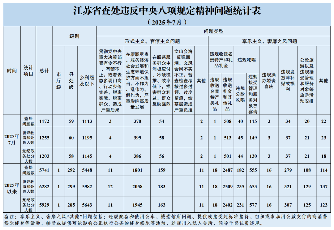 2025年7月,全省共查处违反中央八项规定精神问题1172起,批评教育和处理1255人、其中给予党纪政务处分1203人。从问题类型看,查处形式主义、官僚主义问题429起、批评教育和处理463人,查处享乐主义、奢靡之风问题743起、批评教育和处理792人。从人员级别看,批评教育和处理县处级干部60人、乡科级及以下人员1195人。
